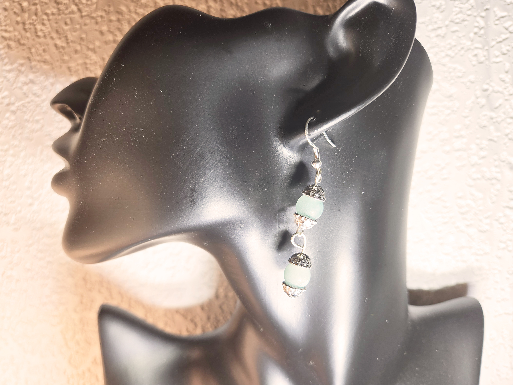These earrings are so cute! They have two round, seafoam green beads linked together. Each bead has a pretty silver cap with a delicate design. The beads look good in a classic style. The caps give them a super timeless feel!
