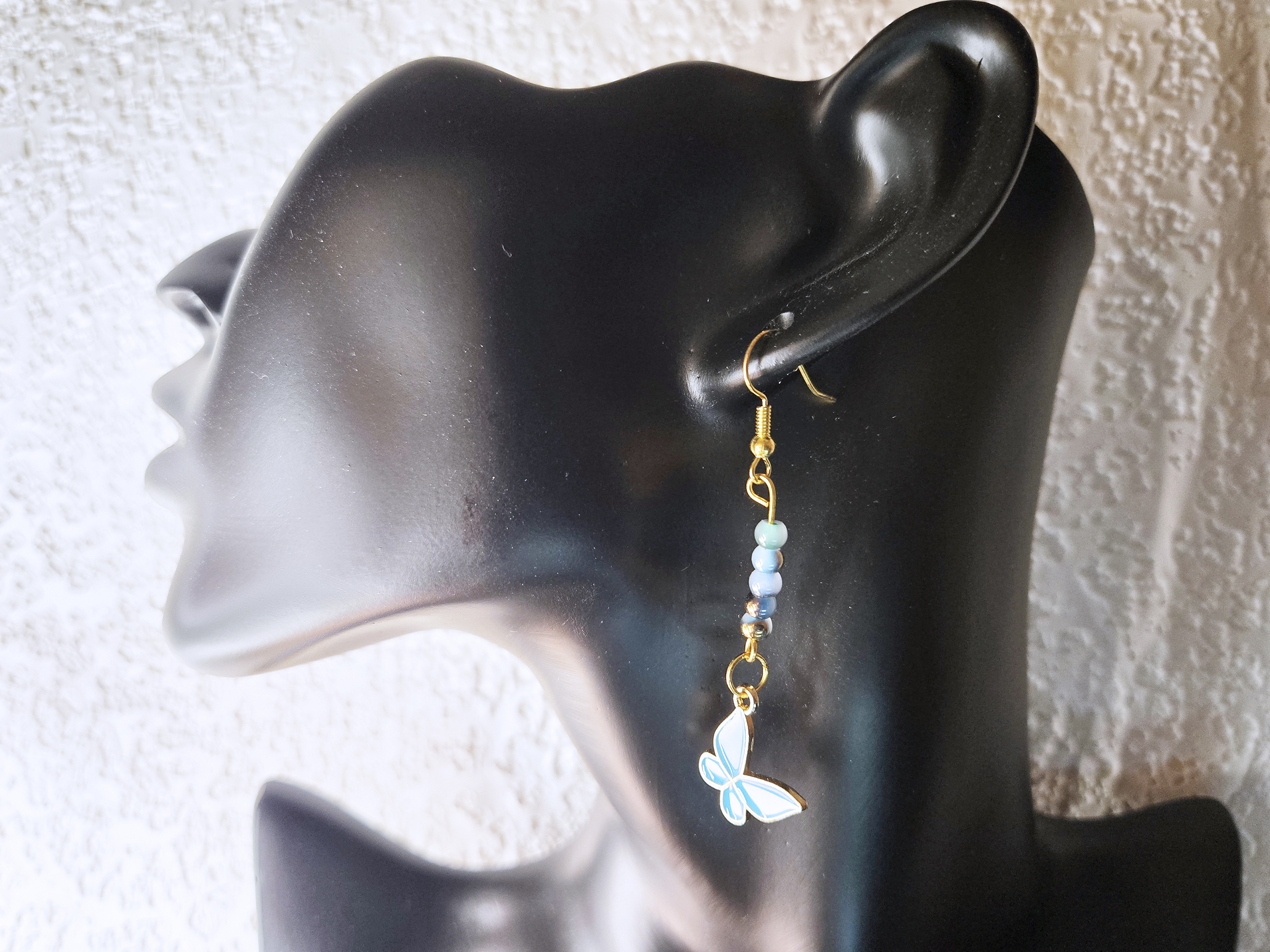 This earring has cute blue beads on a gold chain, giving off a calm vibe. A sweet blue and white butterfly hangs from the beads, making it a fun and classy touch to your style. It all connects to a simple gold hook.