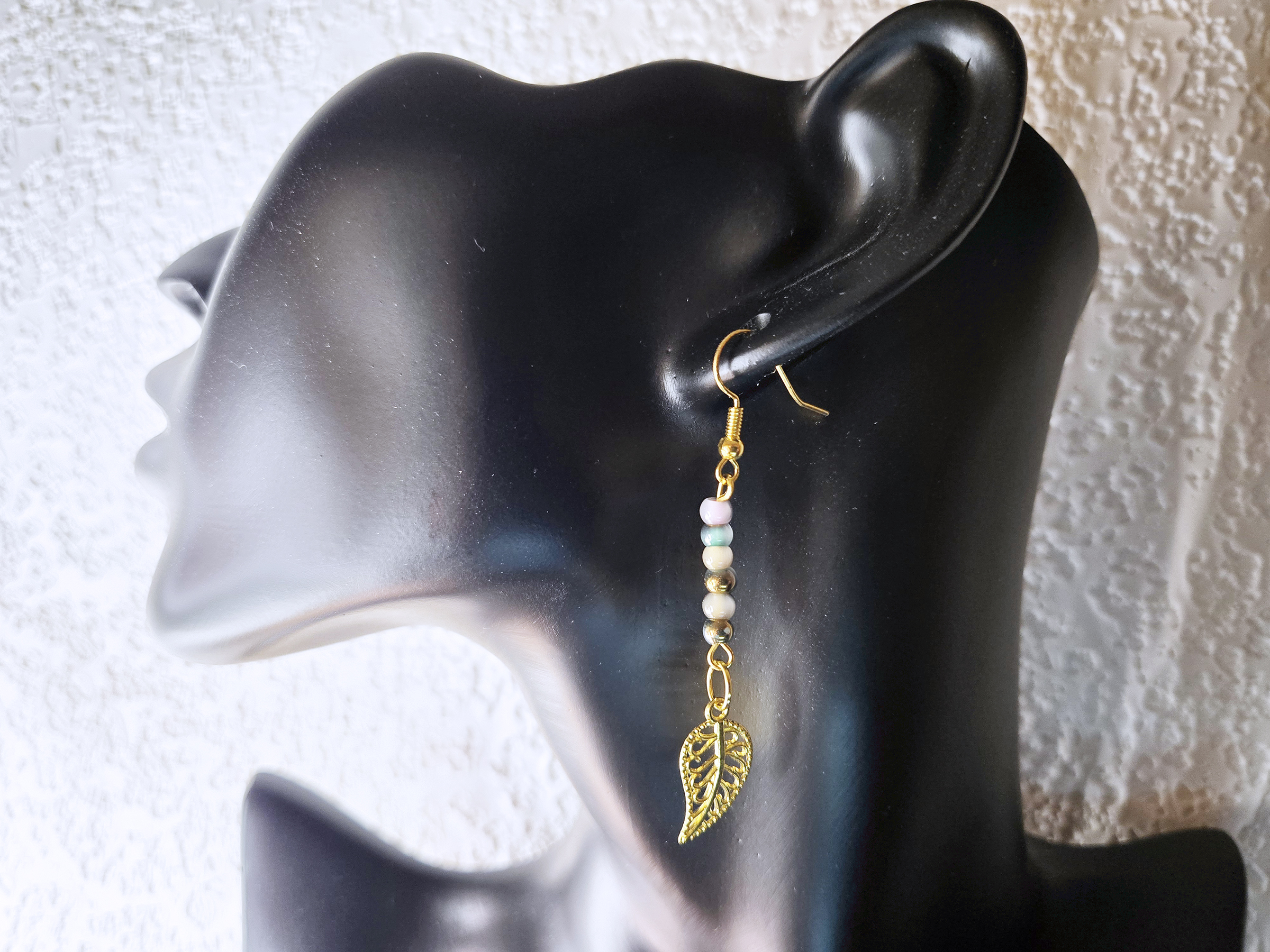 This earring has a gold chain with cute, linked beads in soft pink, white, and clear blue – super relaxing colors! A pretty gold leaf hangs at the end. It’s got a simple gold hook, so it’s great if you’re into simple, pretty jewelry.