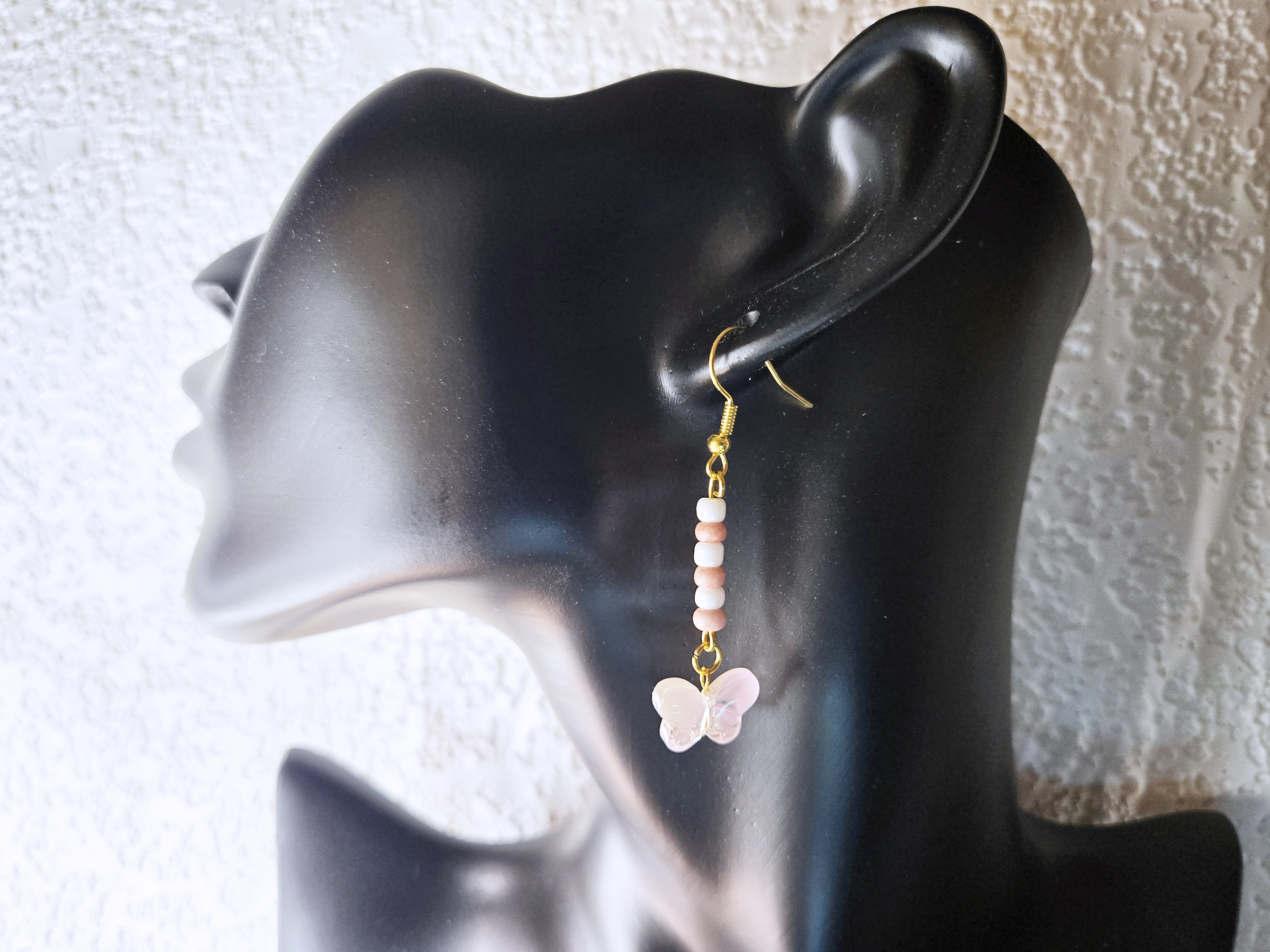 This earring has a gold chain with linked beads. The top beads are creamy pink and white. A soft pink, see-through butterfly hangs from the chain. With its simple gold hook, it’s a great way to add a little something nice to anything you wear.