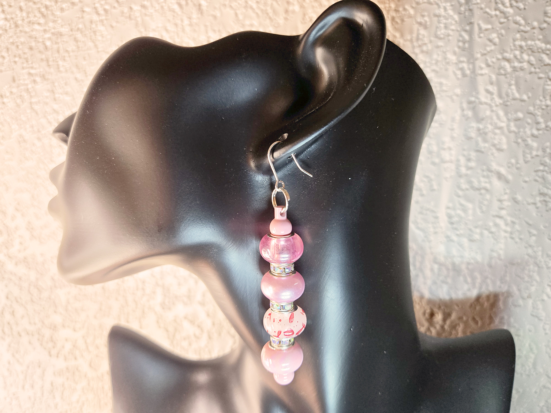These cute earrings have a playful design with five pink beads stacked together, each set apart by tiny, silver-like spacers. To keep things interesting, the beads are a bit different in size and kind. The ones at the top and bottom are smaller and a simple, light pink shade. The three in the middle? They’re bigger and look like smooth, shiny, light pink glass. One of these larger beads even has some darker pink spots or swirls inside, making it look like candy! All in all, they’re sweet and bright – just the thing if you want to add a bit of girly color!