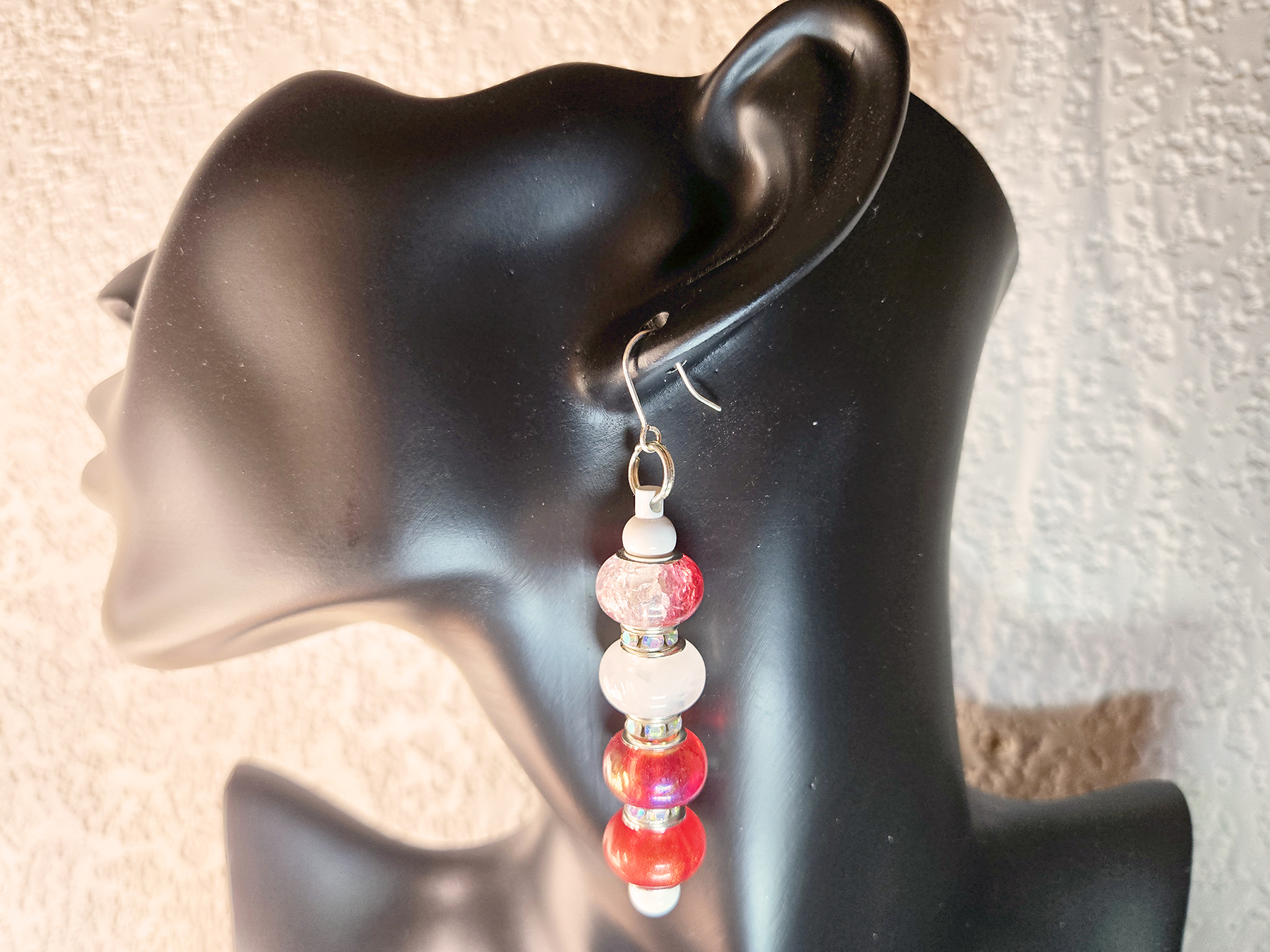 They’ve got a fun mix of red and white beads stacked up in a column of five, all held together with silver bits and tiny gray or white spacer beads. There are three bigger, round beads with the top and bottom ones in a shiny red or cranberry color. The middle bead is a smooth, milky white that sets it off. Plus, there’s a small, clear or slightly pinkish crystal that gives a little sparkle. If you want to add a pop of color, they are playful and sure to catch your eye!
