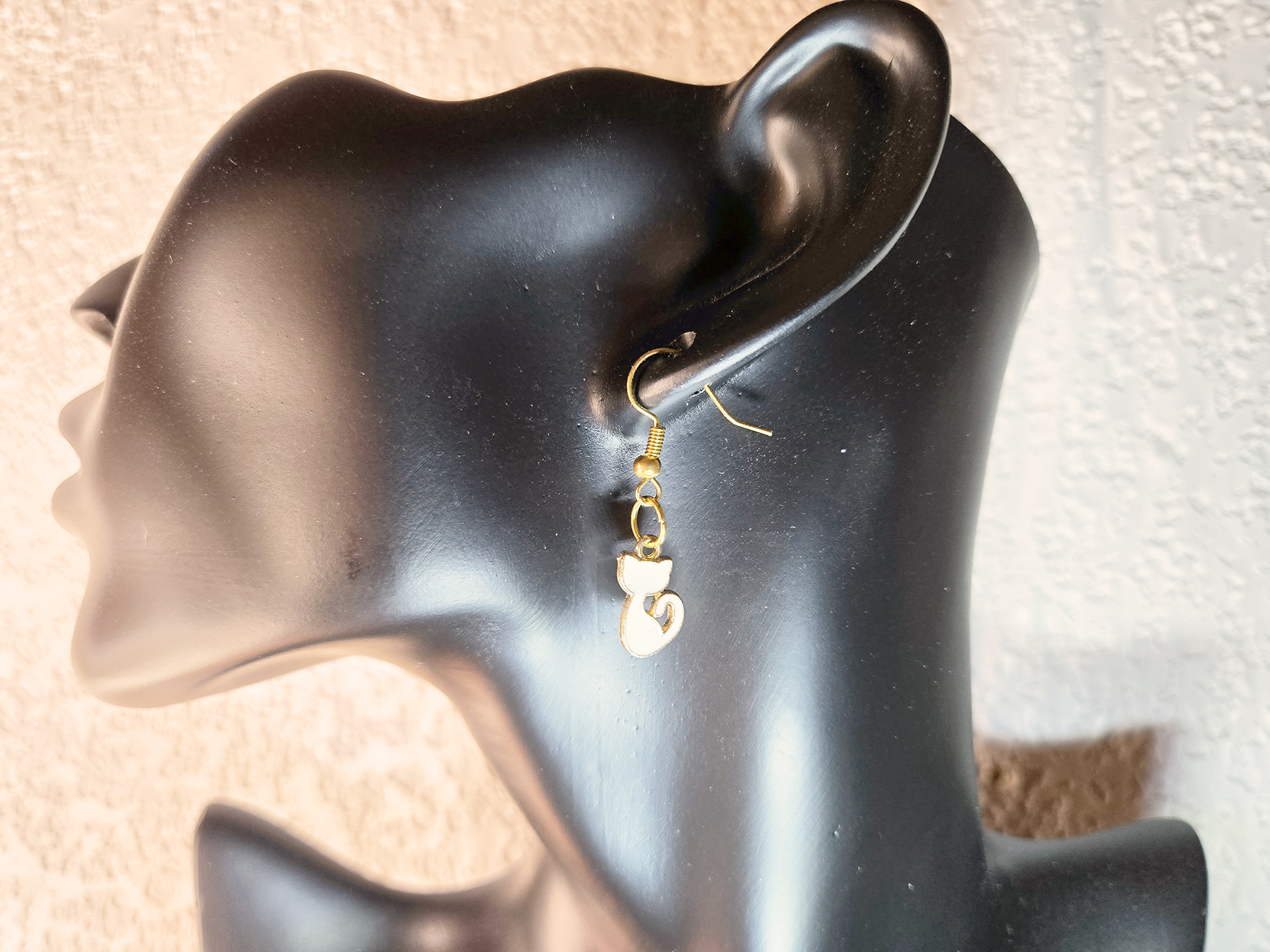 Check out these cute cat earrings! They have gold-colored hooks, a little chain, and a small white cat charm with a black outline and a fun, swirly tail. They’re a sweet and simple way to add a little something extra to your look.