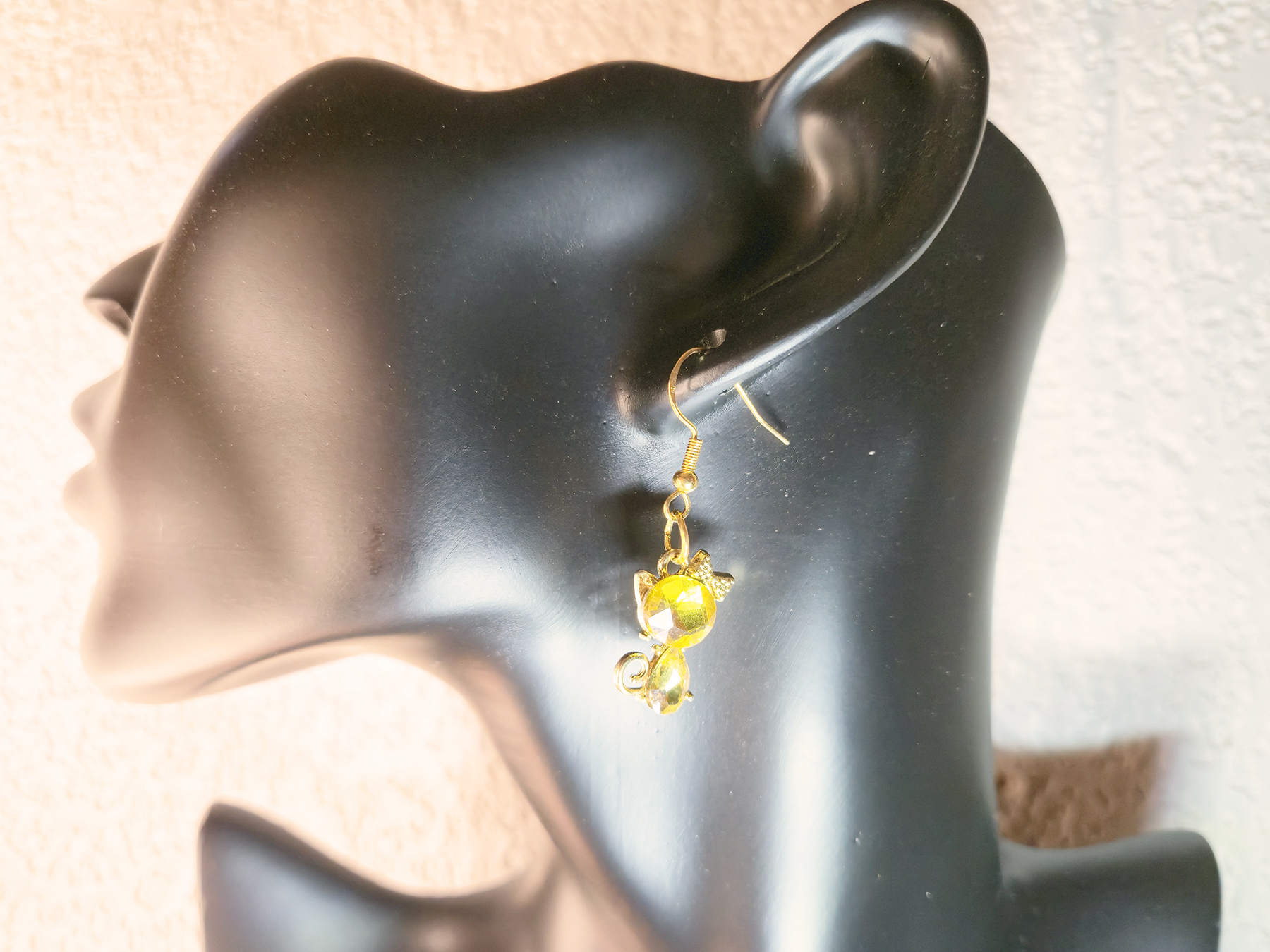 These earrings are super cute and fun! They have tiny cat charms hanging from gold-tone hooks. The cats each have two pretty yellow gems that sparkle, one for the head and one for the body.