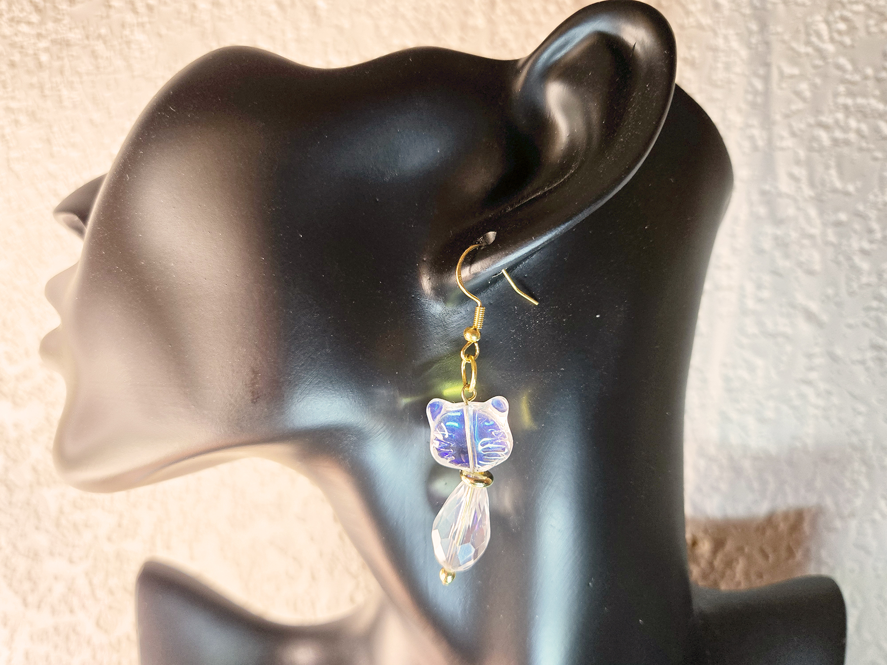 Check out these cute cat earrings! They have gold-tone hooks with a little chain. The cool part is the cat-shaped gem – it’s got blue and purple mixed in up top and a clear, white body. These earrings are a fun and stylish way to add something special to your look!