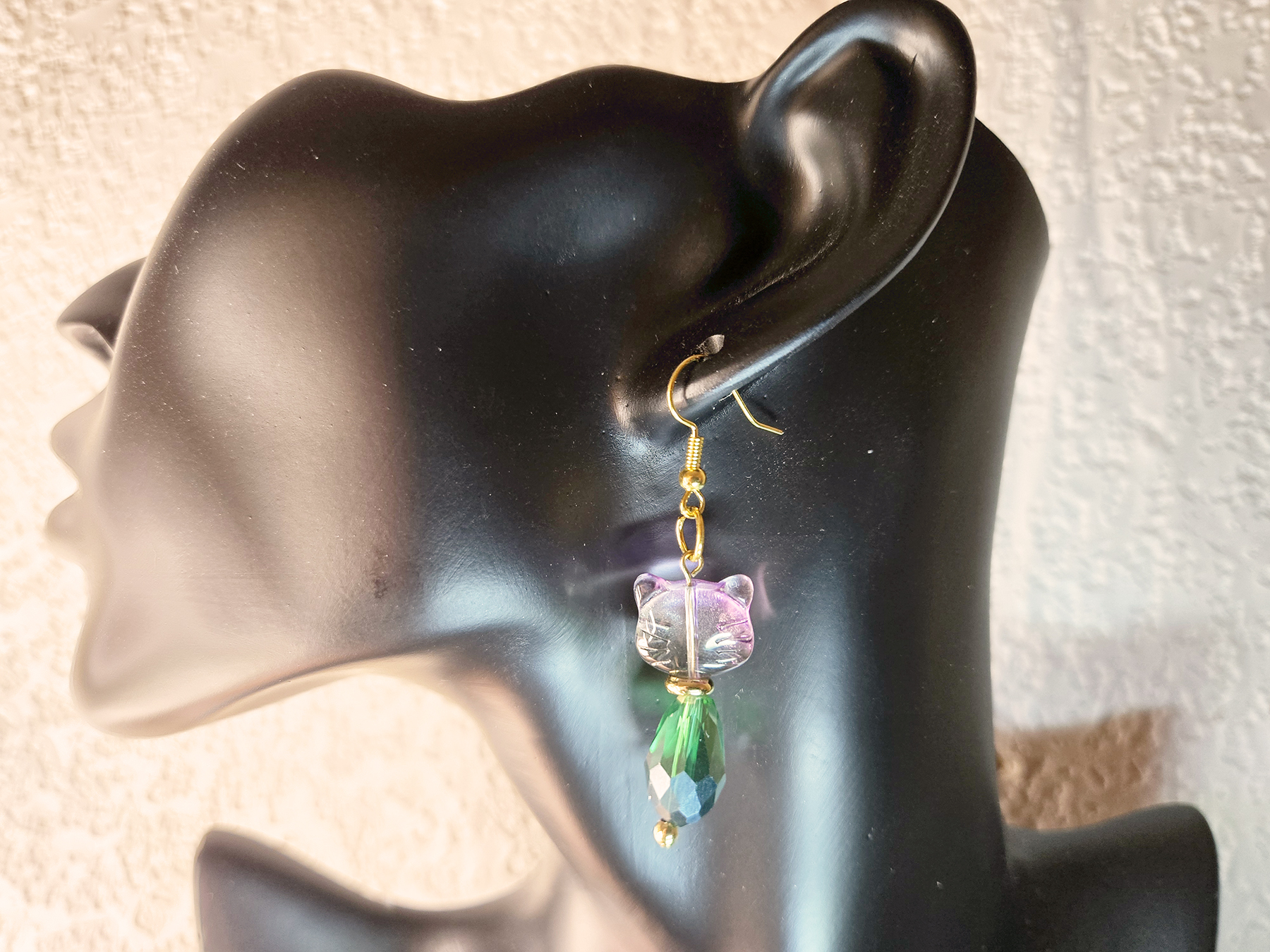 Check out these cute cat earrings! They have gold-tone hooks and chains. The charms are cool cat-shaped gems with purple and blue colors on the head and a clear, green body. It’s a fun and stylish mix!