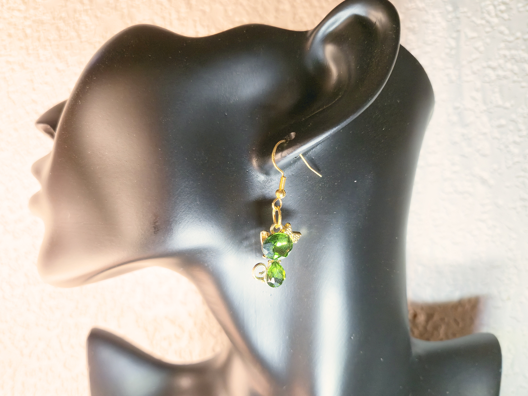 These earrings are super cute and fun! They have a sweet little cat charm hanging from a simple gold hook. The cat has two pretty green gems that sparkle – one for its head and a bigger one for its body!