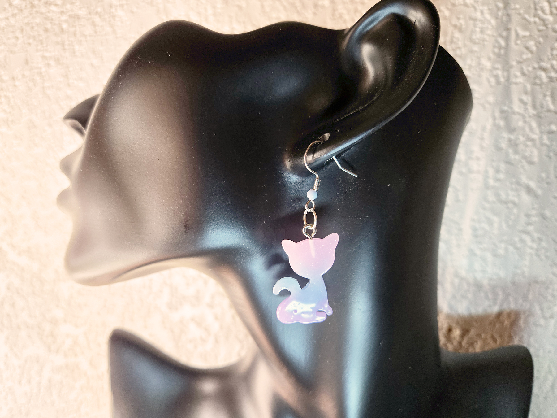Check out these cute cat earrings! They have silver-tone hooks with some little blue beads on a short chain. The best part is the pearly cat charm, with its sweet pink and blue fade that makes it look all dreamy and see-through.