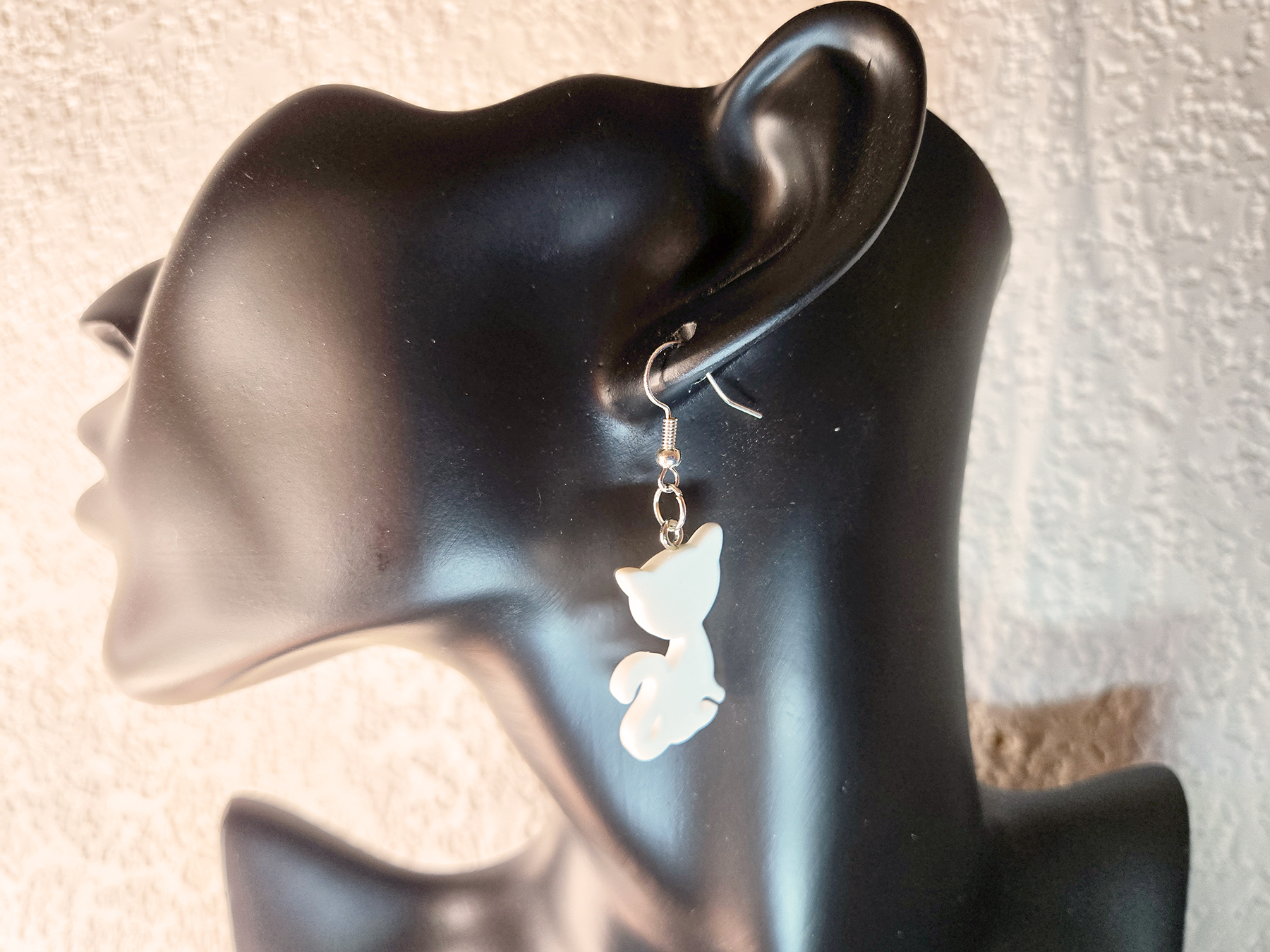Check out these cute cat earrings! They have silver-colored hooks and some little beads on a chain. The best part is the pearly white cat charm – it looks so dreamy and see-through!