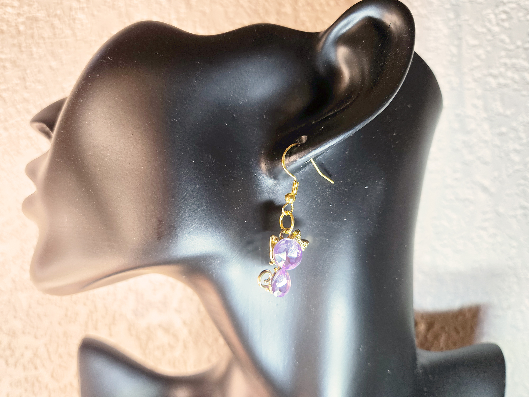These earrings are super cute and fun! They have a tiny cat charm hanging from a gold hook. The cat has two sparkly, light purple gems – one for the head and a bigger one for the body. They just look so pretty!