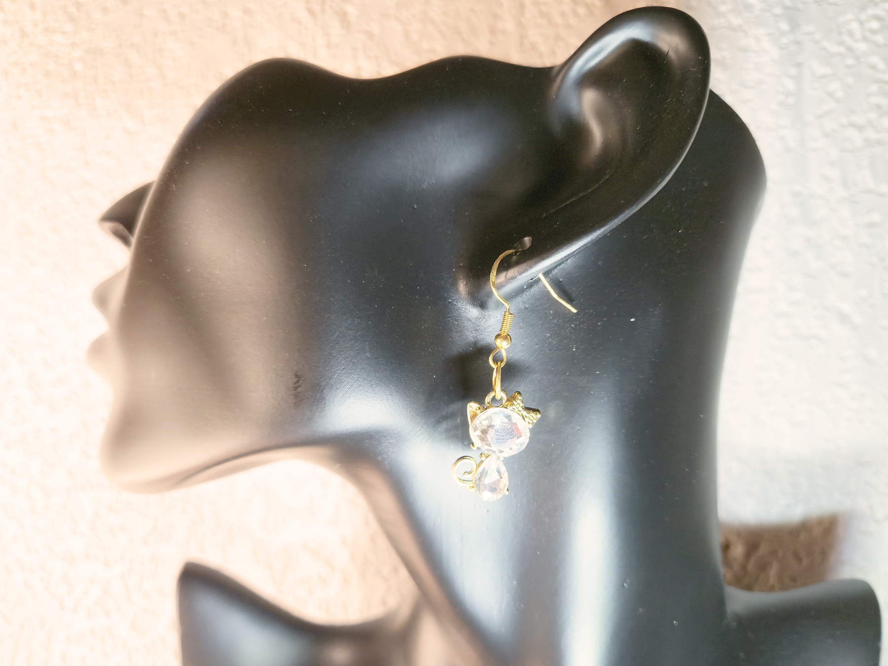 These earrings are super cute and fun! They have tiny cat charms hanging from plain gold hooks. The cats each have two shiny stones, a small one for the head and a bigger one for the body, so they sparkle nicely.