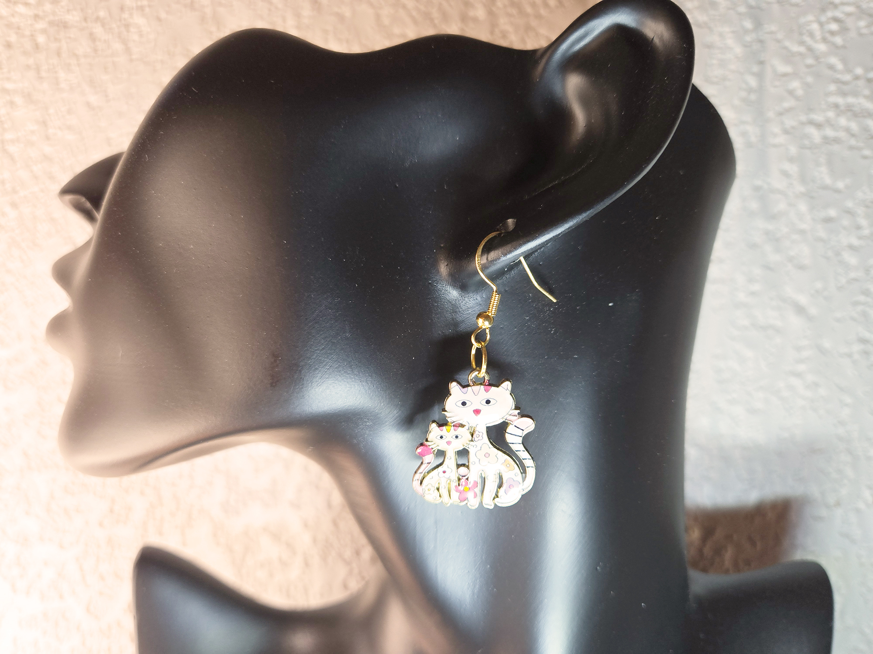 These earrings are super cute and sweet! They have a gold hook with an enamel cat and kitten charm hanging off them. The cats are white and pink with little yellow dots. It’s a fun design and give off a playful vibes!