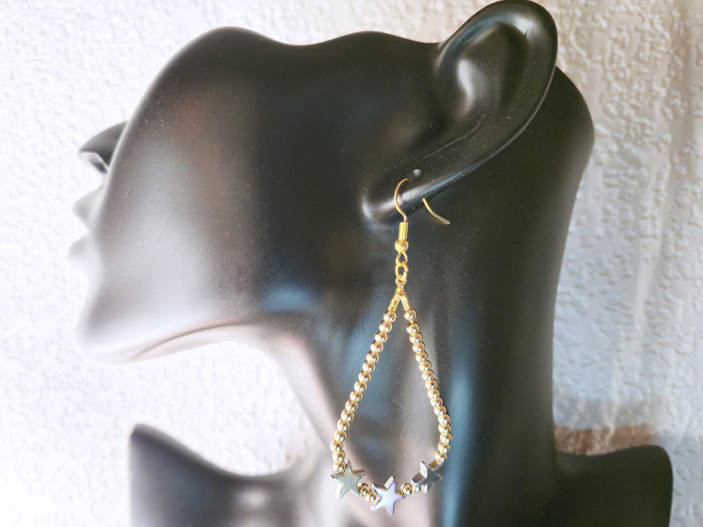Add a playful sparkle to your look with these elegant dangle earrings. Featuring a delicate teardrop shape made of shiny gold-toned beads, each earring is accented with three star charms for a whimsical, celestial touch.