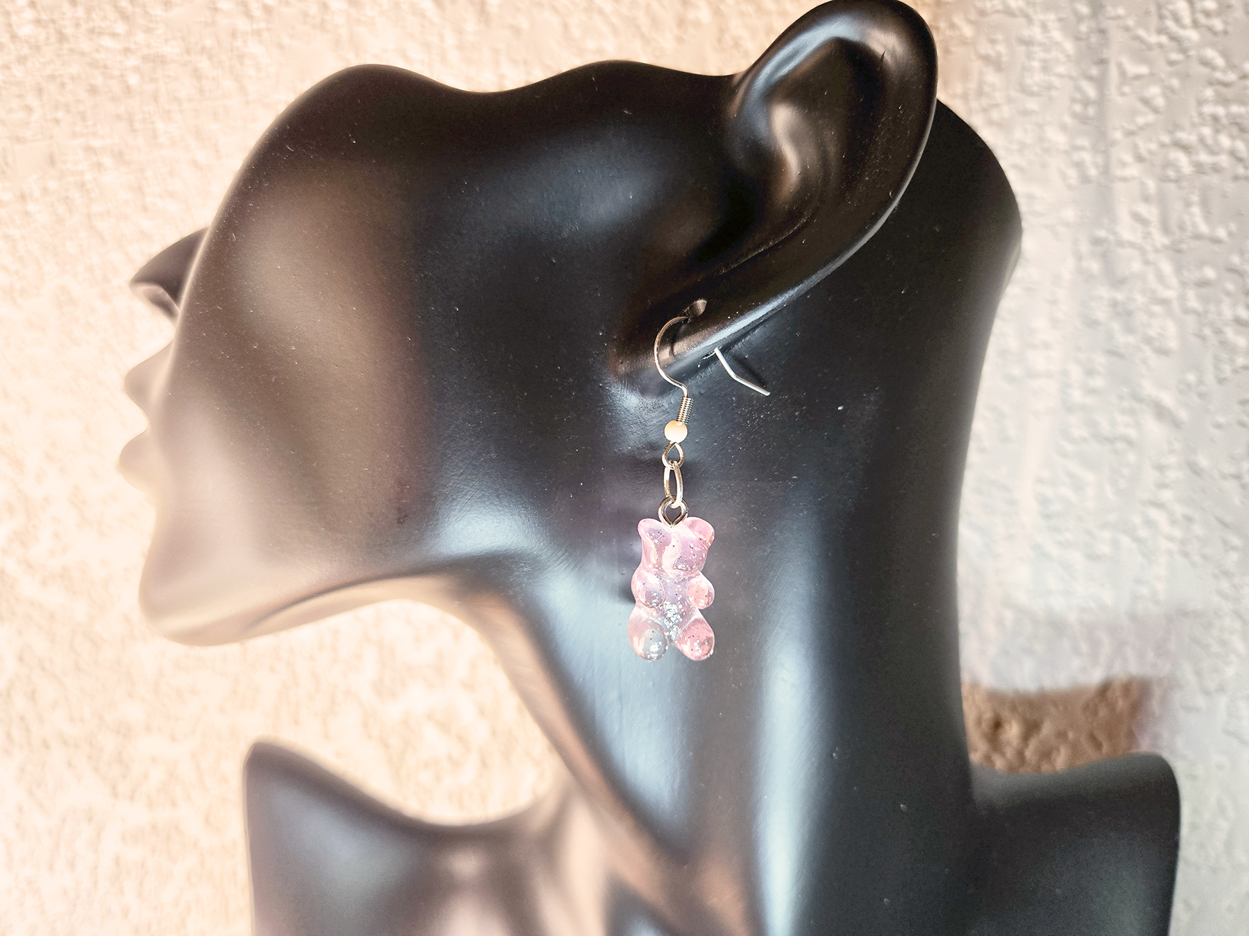 These dangly earrings have another sweet gummy bear charm, but here’s the cool part: it’s got silver glitter inside! The bear is see-through pink resin, and the glitter inside makes it super sparkly and fun.