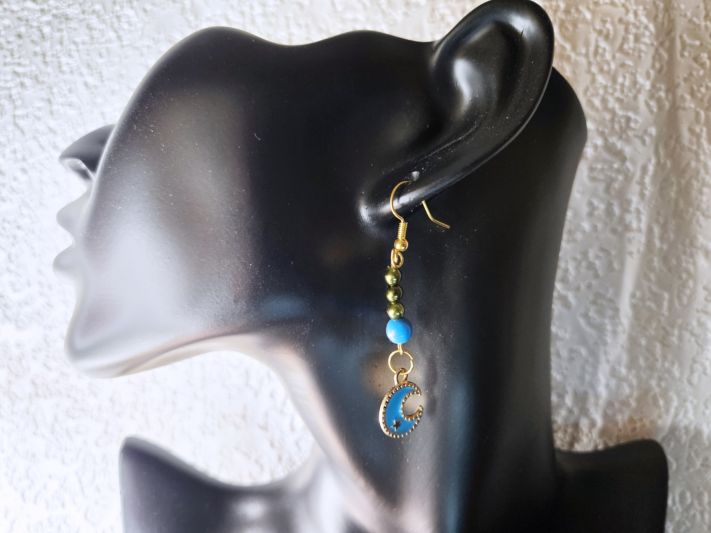 This earring is super cute! It’s got green and blue beads strung on a shiny gold chain. A sweet blue moon charm with a tiny gold star hangs down below. It all connects to a simple gold hook for your ear. Perfect if you’re into stars and moons!