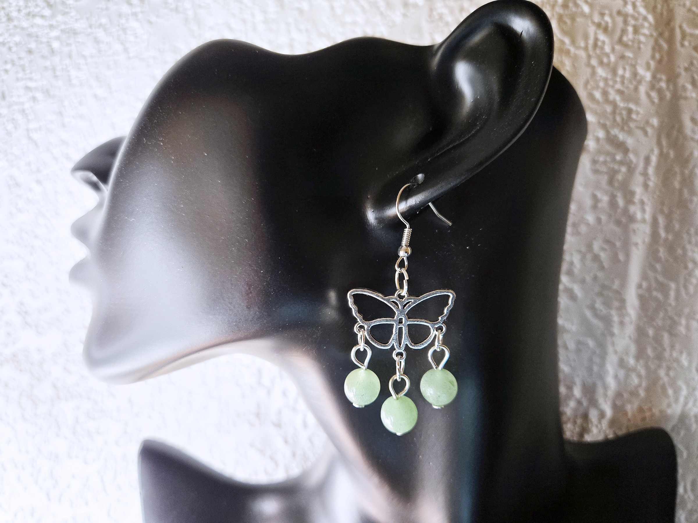 That earring is so cute! It’s got a silver butterfly with light green beads hanging from its wings. It’s got a simple hook, and it feels light, fun, and nature-y.