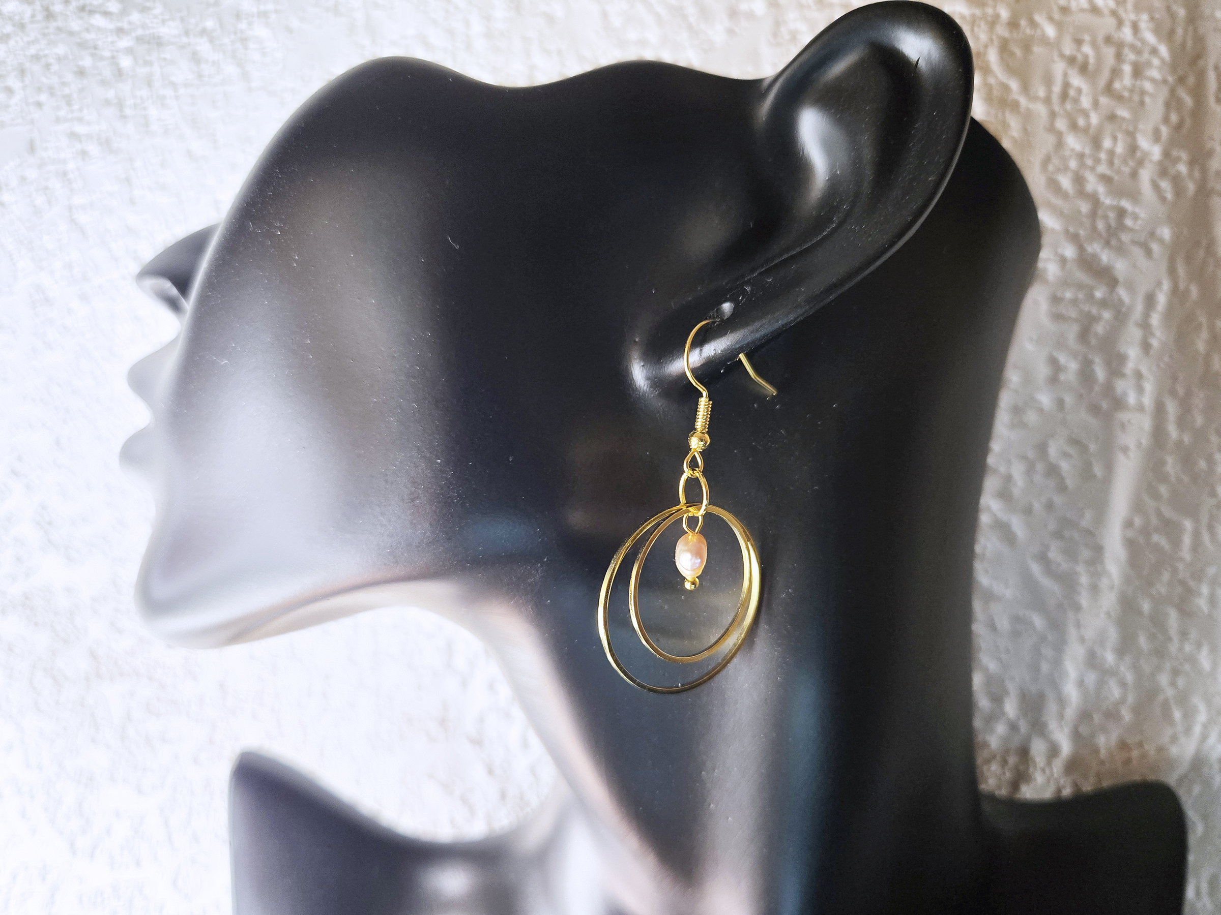 This earring has two gold rings, one inside the other, for a cool geometric look. A pink pearl bead hangs inside the smaller ring and shimmers when the light hits it. It hangs from a dainty gold hook, so it’s great for adding a little color and style.