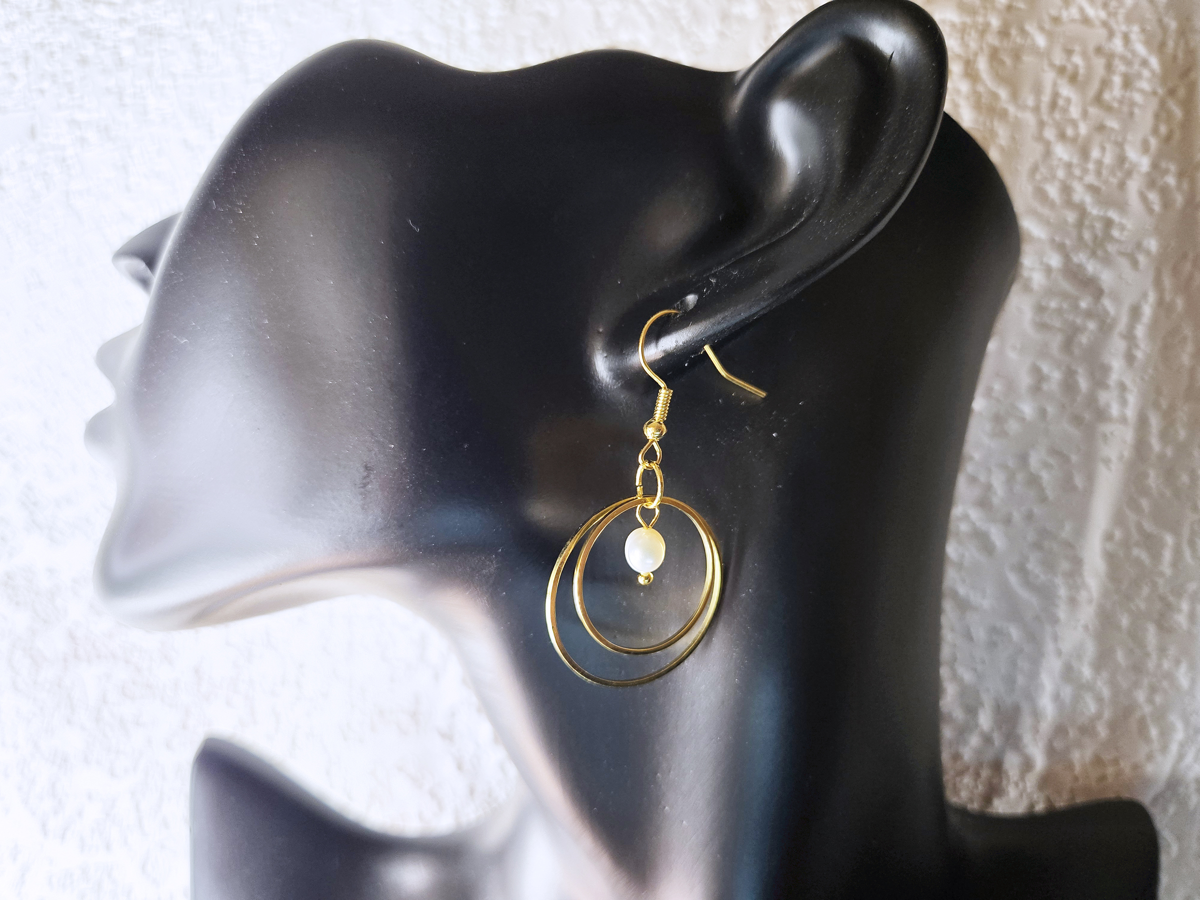 This earring has two gold rings that give off a simple and cool vibe. There’s a pretty white pearl bead hanging inside the smaller ring. It hangs from a dainty gold hook. It’s a mix of classic and new, and the pearl makes it look extra classy.
