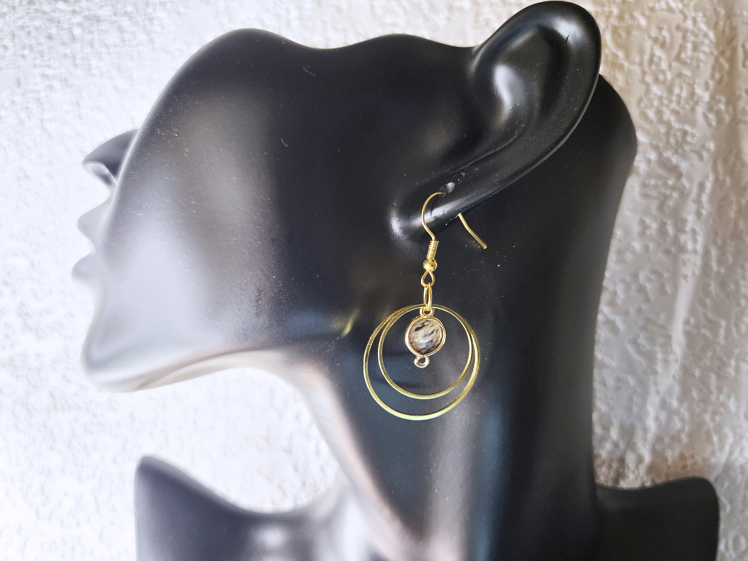 This earring has two gold-tone rings in a simple, cool design. This earring has two gold-toned rings in a cool geometric design. The smaller ring holds a shiny paua stone charm. It hangs from a basic gold-tone hook, so it’s easy to add some natural and modern style to your outfit.
