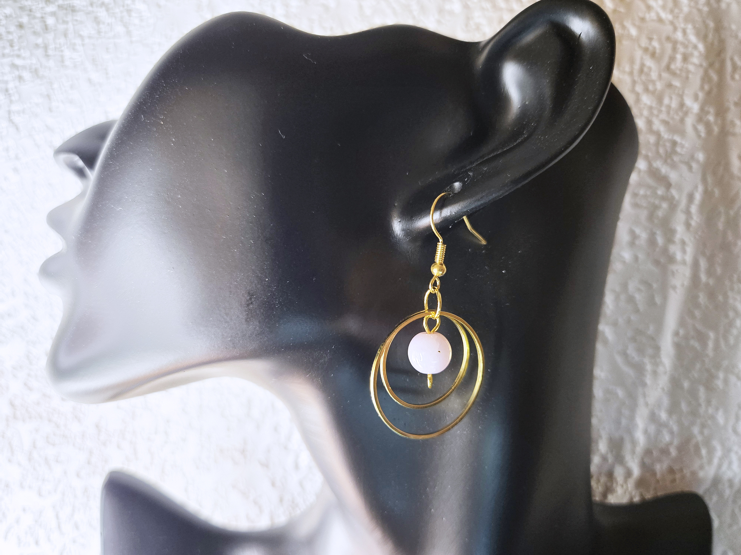 This earring has two gold-tone rings in a simple, cool design. The inner ring holds a neat round white bead. It hangs from a basic gold-tone hook, so it’s easy to add some natural and modern style to your outfit.