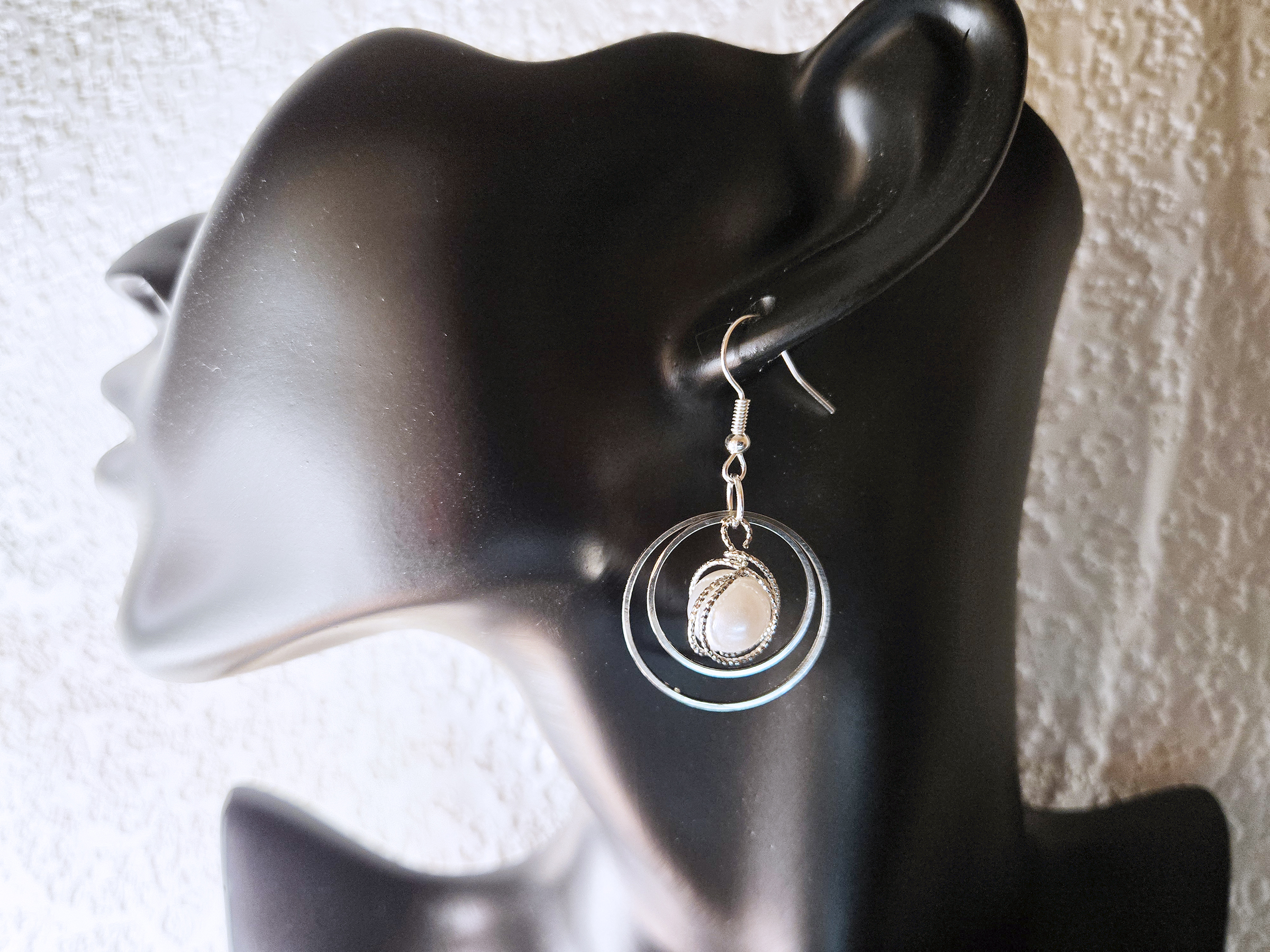 Oh, thoseearringslookpretty! They have this cool white bead that looks like it’s glowing, all wrapped up in a textured wire thing. And the bead hangs inside two shiny silver hoops. It’s a really modern and eye-catching look.