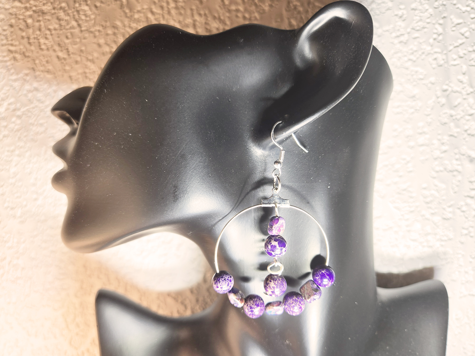 Wow, check out these earrings! They’ve got these great silver hoops, and what’s cool is they dangle with a bunch of awesome purple marbled beads. The pattern on the beads is super unique, giving them a fun, artsy vibe.