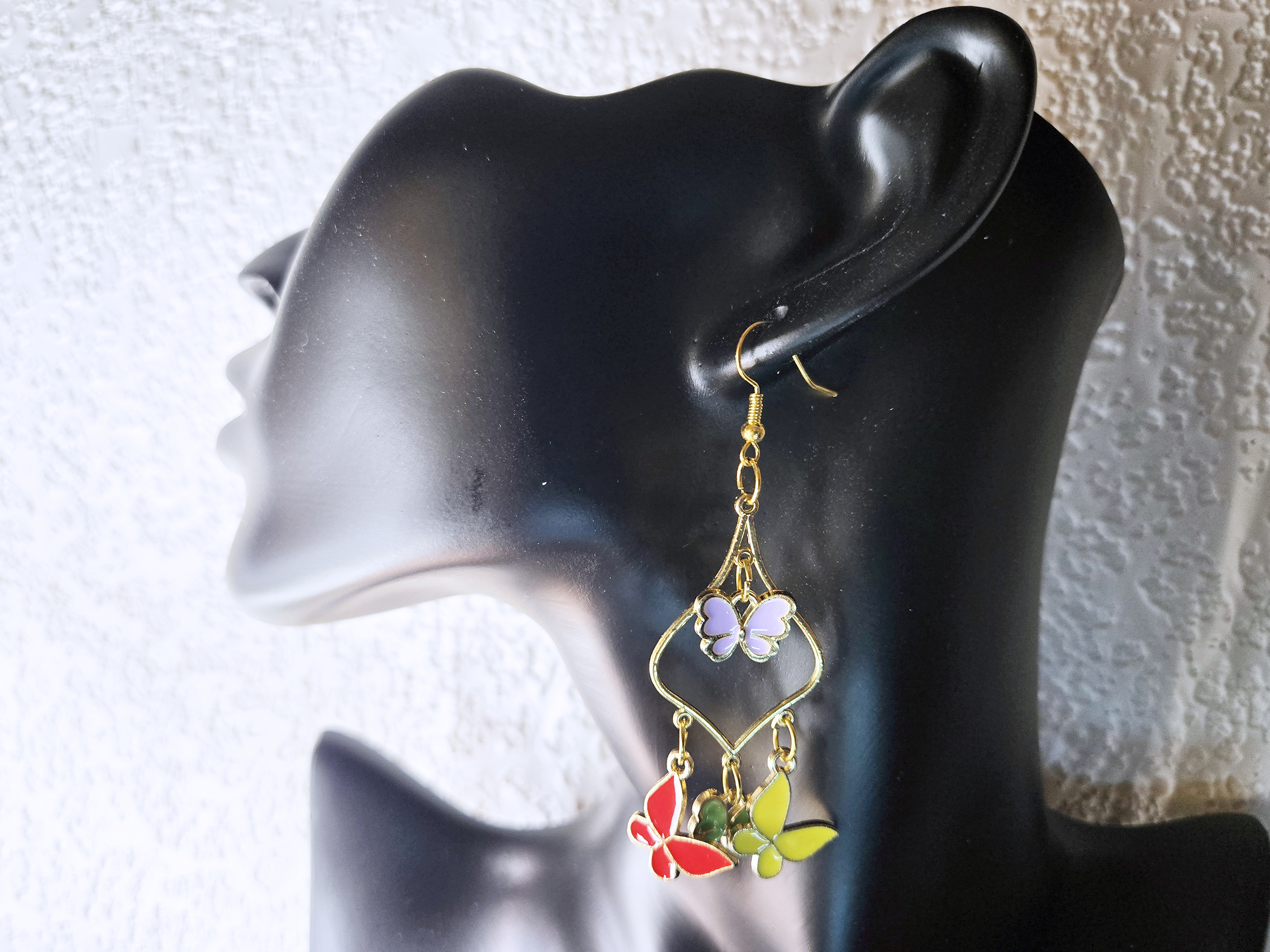 This earring features a cool lantern or diamond shape crafted from shiny gold wire. Inside, there’s a cute butterfly with purple wings for a splash of color. Three smaller butterflies dangle below—one with red wings, one with green and one with yellow. It all hangs from a simple gold hook. It’s a fun and charming piece!
