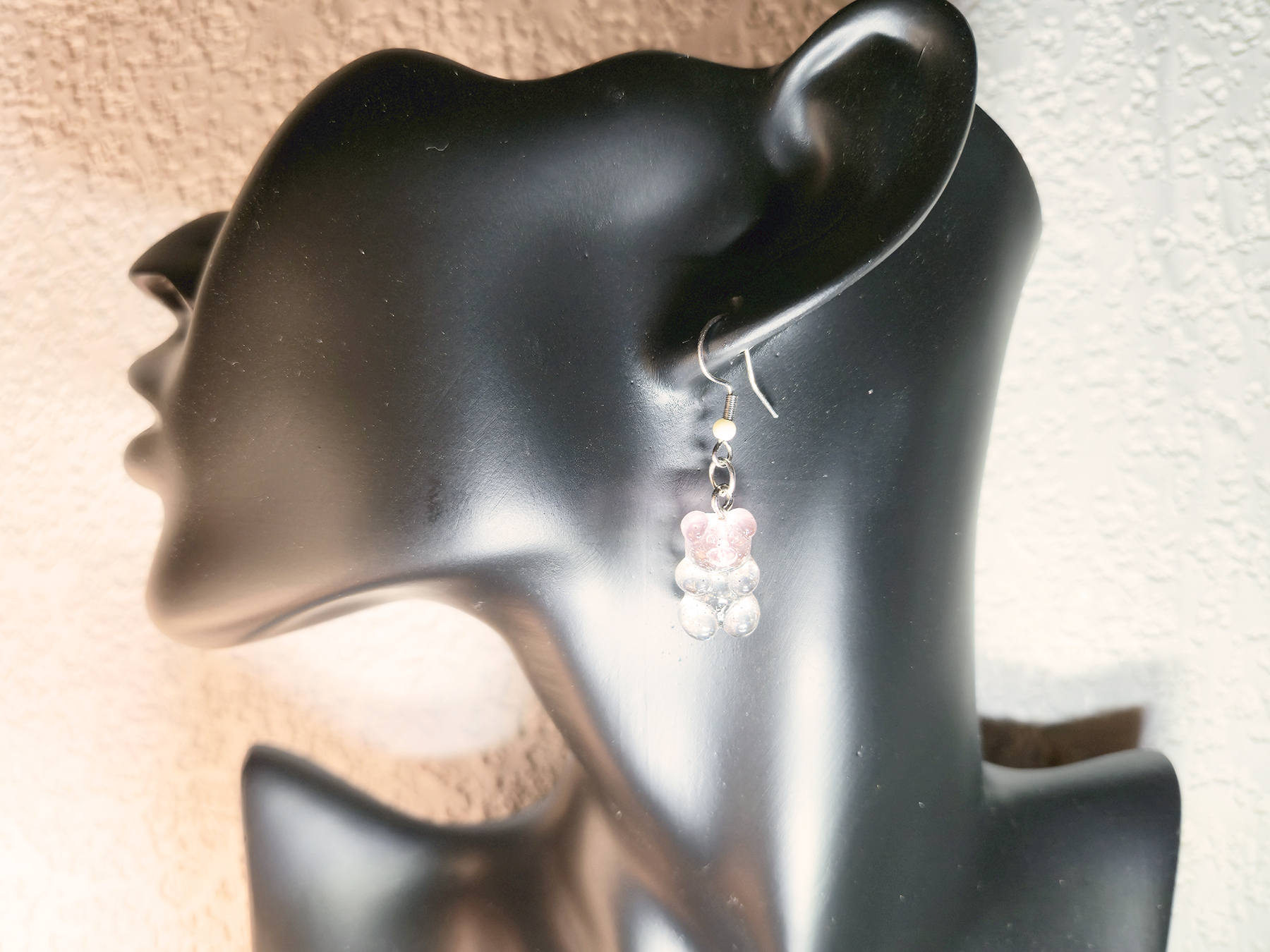 These earrings are super cute! They have little gummy bear charms that fade from light pink to clear. Plus, there’s a tiny white bead on top that adds a bit of sparkle. They’re really fun and sweet!