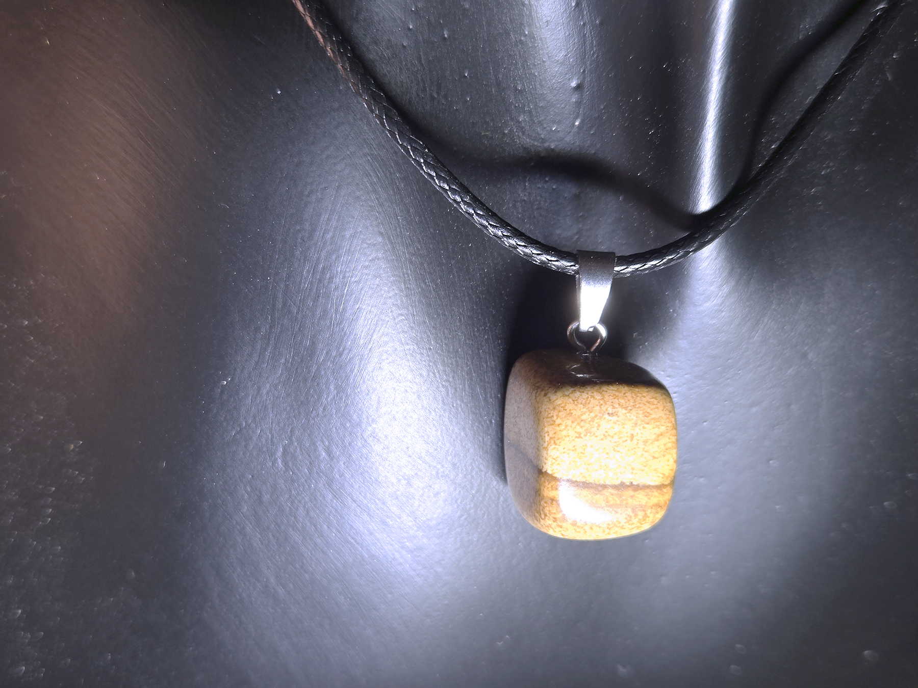 Okay, so the star of the show is this gemstone pendant – think smooth and comfy to touch. It’s a square or rectangle shape, but with soft, rounded edges. The color is super pleasant, like a light yellow-brown or tan, with these cool stripes or sections of rusty orange or red-brown running through it. It’s shiny, so you can really see the stone’s natural bands – kinda like a fancy type of picture jasper. It hangs from a simple, shiny silver loop, attached to a clean black cord. The cord makes the pendant pop and gives it a stylish, earthy vibe.