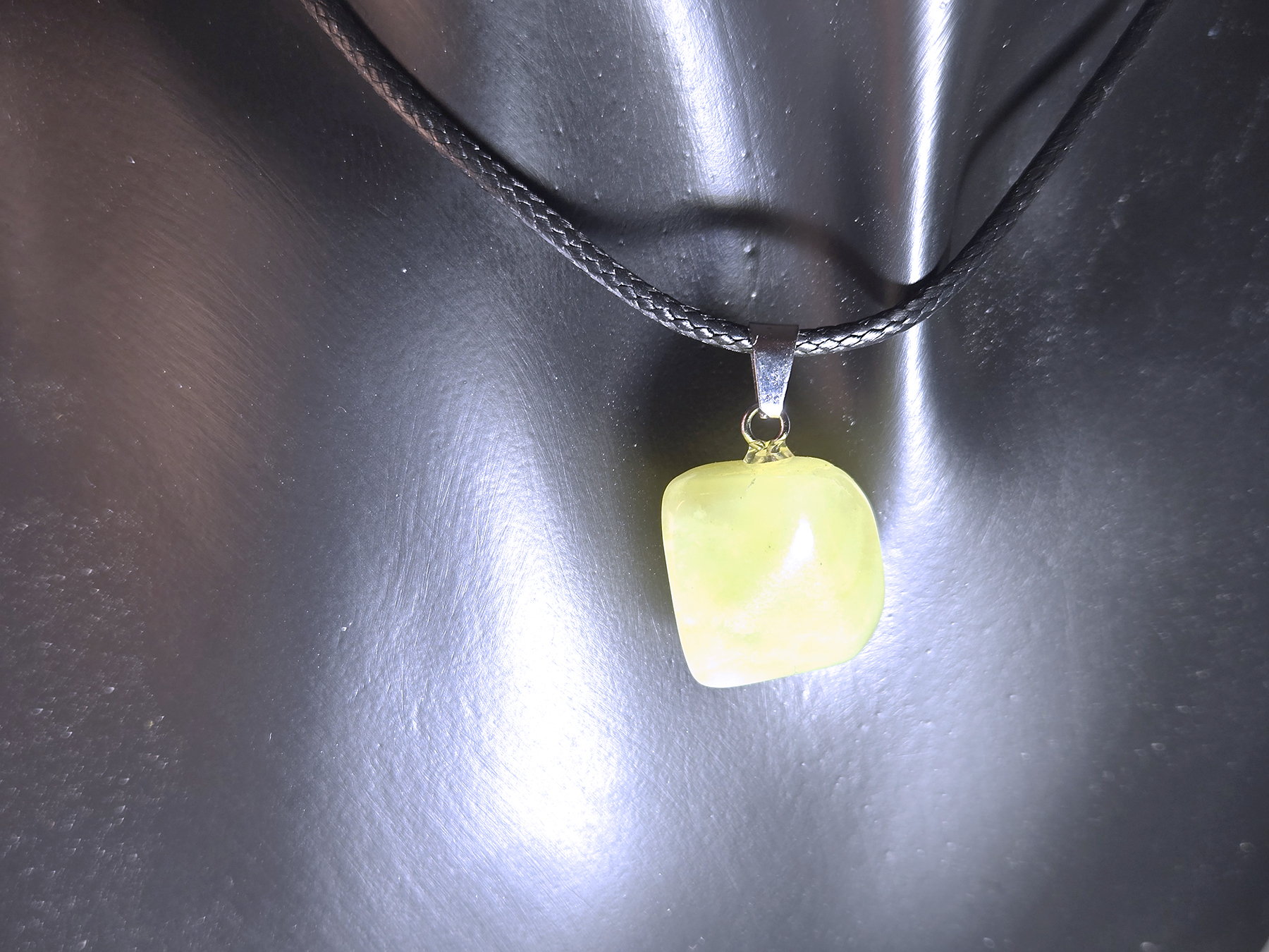 This pendant is super cute! It has a smooth, tumbled gemstone that’s kind of rectangular but with soft, rounded edges. The stone has this awesome bright color—it looks like a pale yellow or a light green that seems to glow when the sun hits it. Maybe it’s Lemon Jade? It hangs from a black cord that makes the stone’s color really pop.
