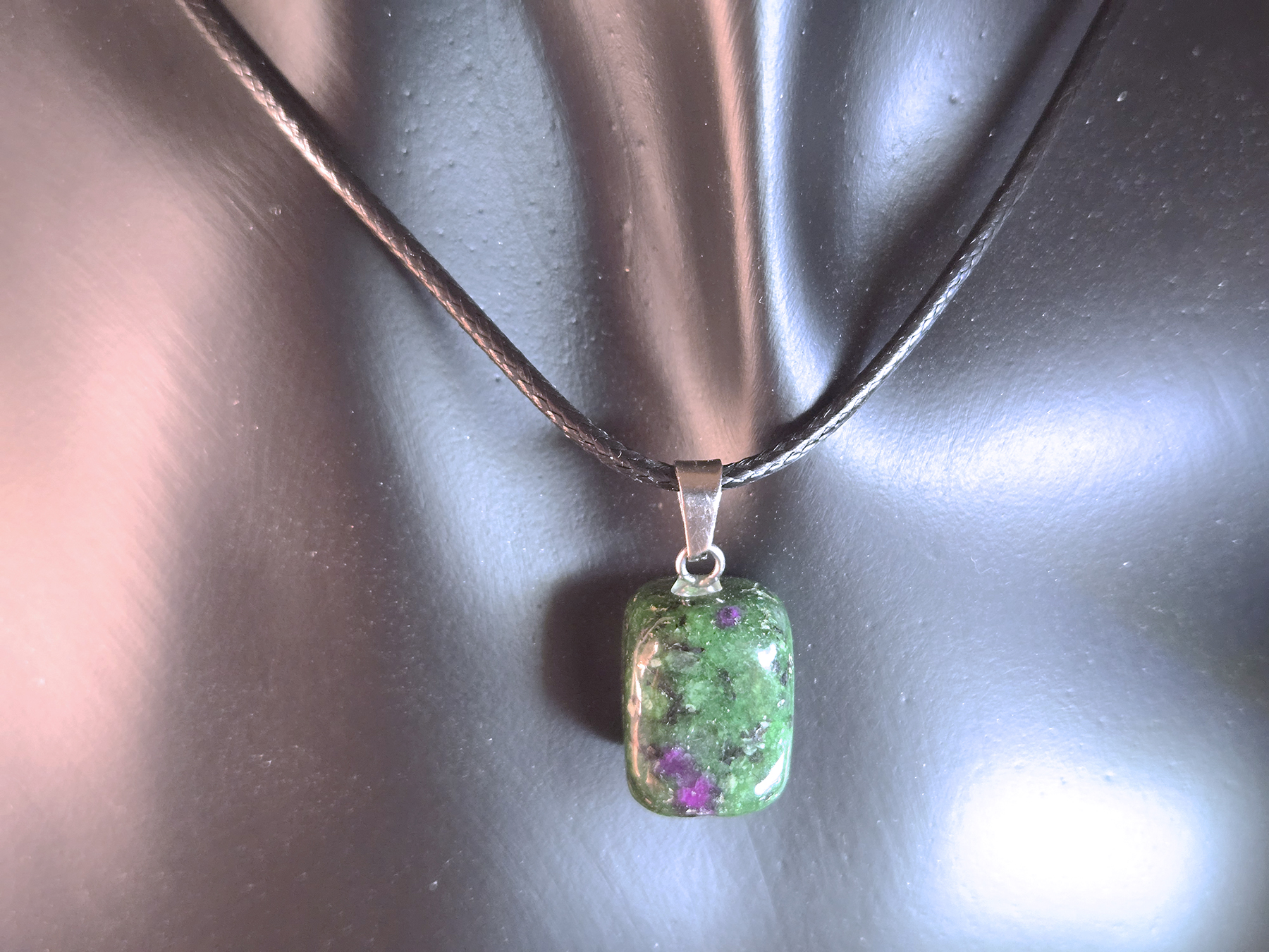 This necklace has a cool pendant that’s a big, tumbled gemstone. The stone is smooth and kinda rectangular with soft edges. It’s got awesome natural colors – like a bright green mixed with spots of deep red. This color mix is what you see in a stone called Ruby in Zoisite. The pendant hangs from a simple, shiny silver loop. The black cord has a braided look. It’s a great piece that mixes nature with a modern style!