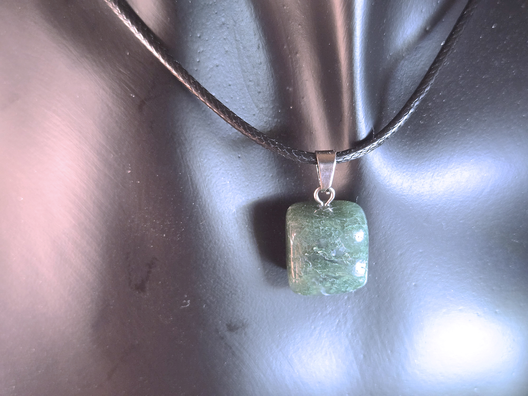 Check out this cool pendant! It’s got a smooth, polished gemstone that’s like a rectangle but with soft, rounded corners. The gem has this awesome deep green color – kind of like jade – mixed with swirls and misty white spots inside. It makes the stone look like it has so much depth, almost like it’s moving! It reminds me of Green Aventurine or maybe Tree Agate. The pendant hangs from a simple, silver thing and comes on a black cord that really makes the green pop. It’s got a natural, but slick look.