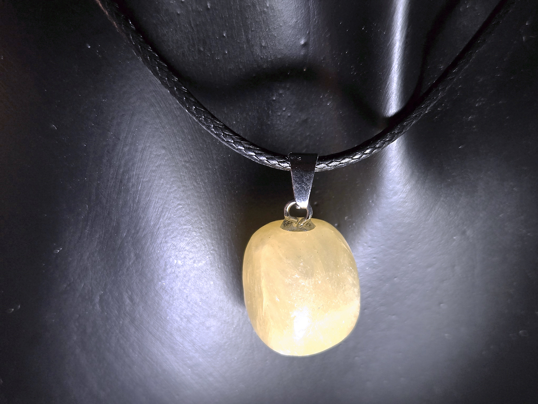 Wow, that necklace is really pretty and peaceful! The best part is the gem – it’s got this smooth, creamy yellow color. It’s shaped like a long oval and glows just a bit, which is super cool. It hangs from a simple, shiny, silver thingy on a braided black cord. The cord makes the gem’s color pop!