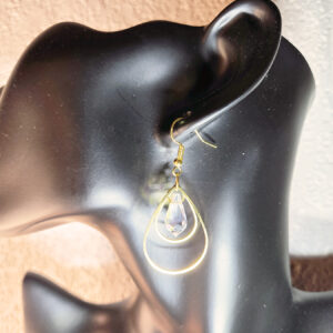 Wow, these earrings are so pretty! They have two gold rings inside each other, like teardrops. And in the middle, there's this clear crystal that catches the light and sparkles with all sorts of colors. They hang from a simple gold hook. Really makes them pop!
